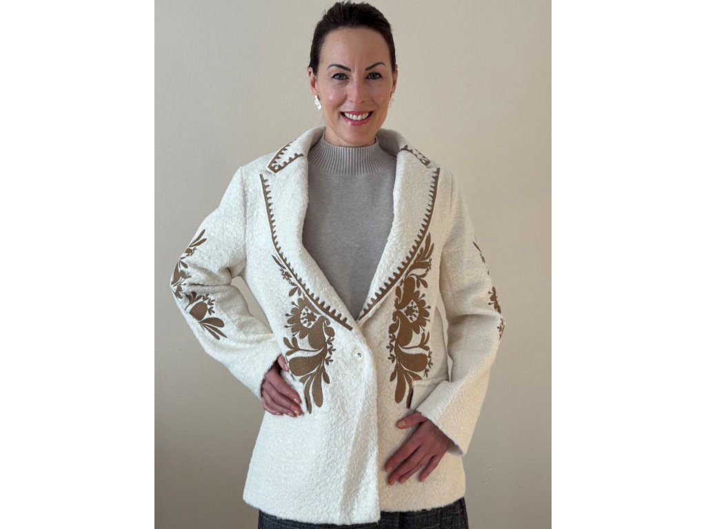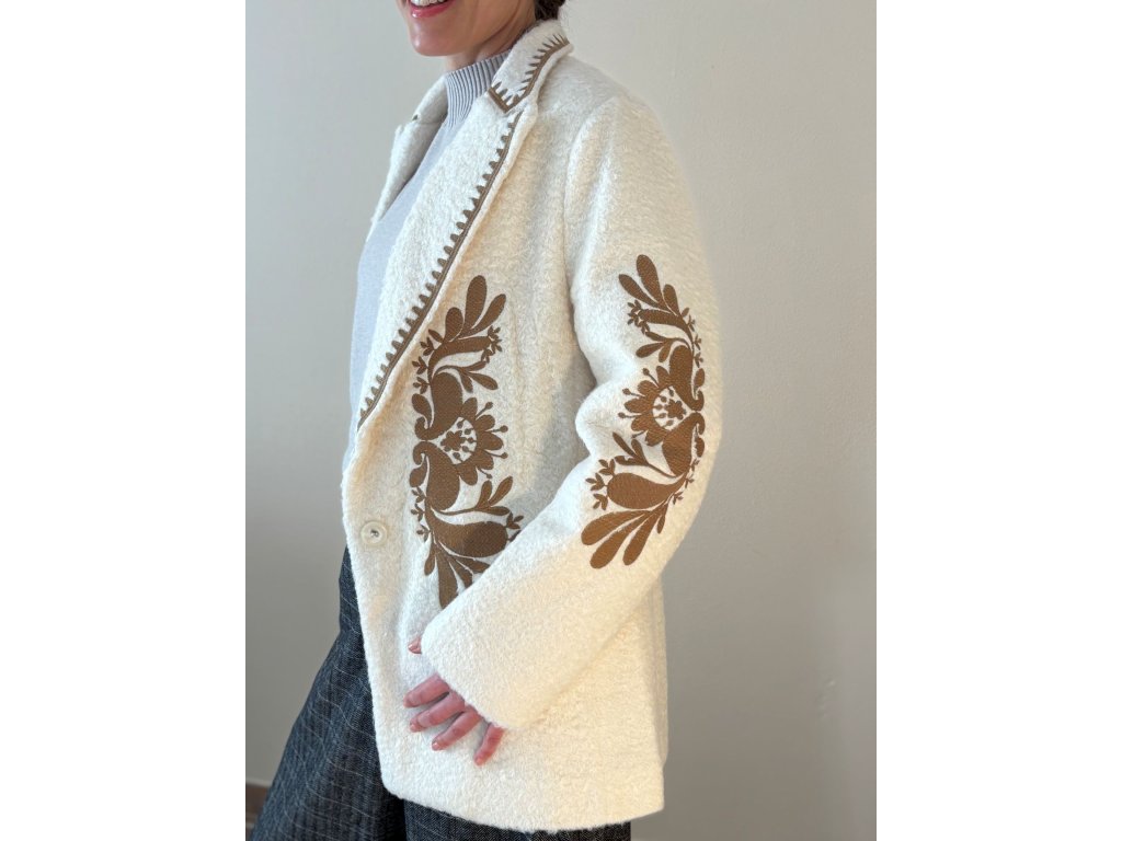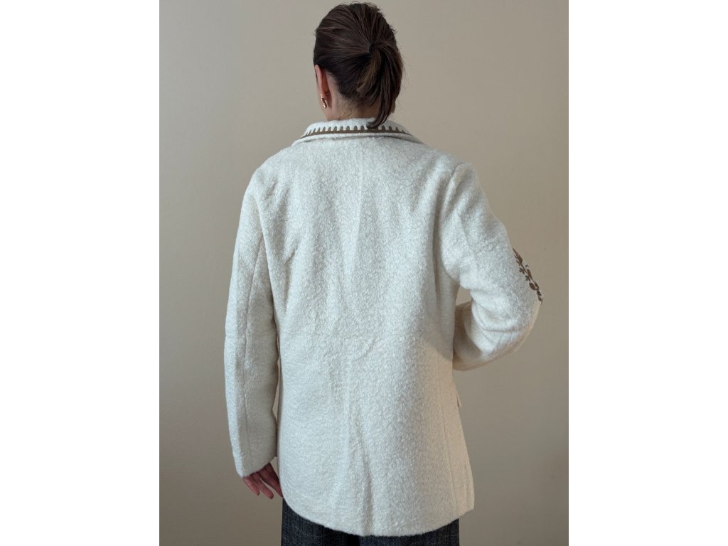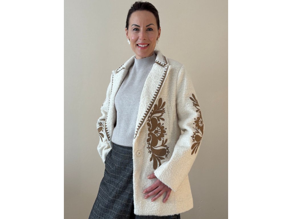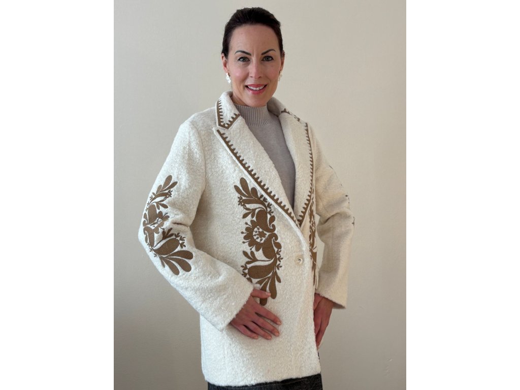 Velice elegantní a moderní, nápaditý jednořadý kabát, ze směsi vlny, oversize střihu, s podšívkou, s vyšívanými motivy