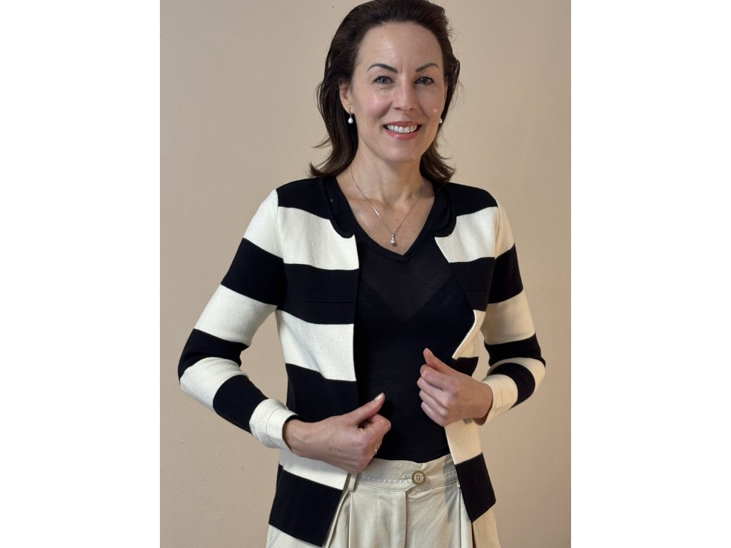 Hebký, teplý a velice pohodlný – tento krátký kardigan ze směsi 53% viskózy, polyesteru a nylonu je ztělesněním jemné elegance. Silnější pruhy dodávají svetru moderní grafický nádech, zatím co materiál na dotek působí hebce a příjemně. Tento kardigan Vám zpříjemní celý den.