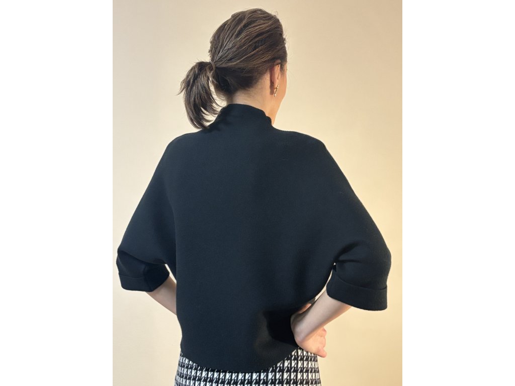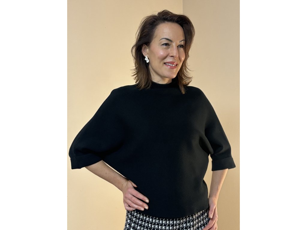 Nadčasový, minimalistický, hebký svetřík, velice elegantní s netopýřími 3/4 rukávy a stojáčkem, ze směsi viskózy